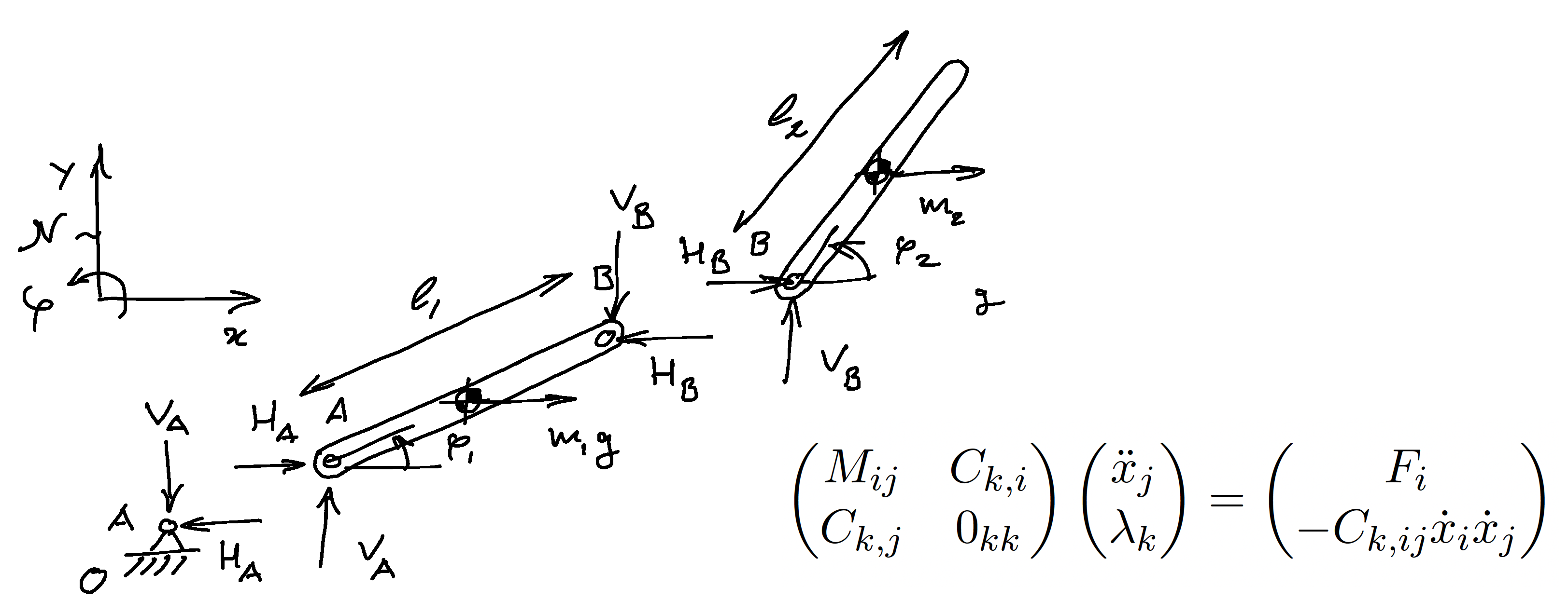 - Systematic approach for a system of interconnected rigid bodies, virtual power method and Lagrangian multipliers.